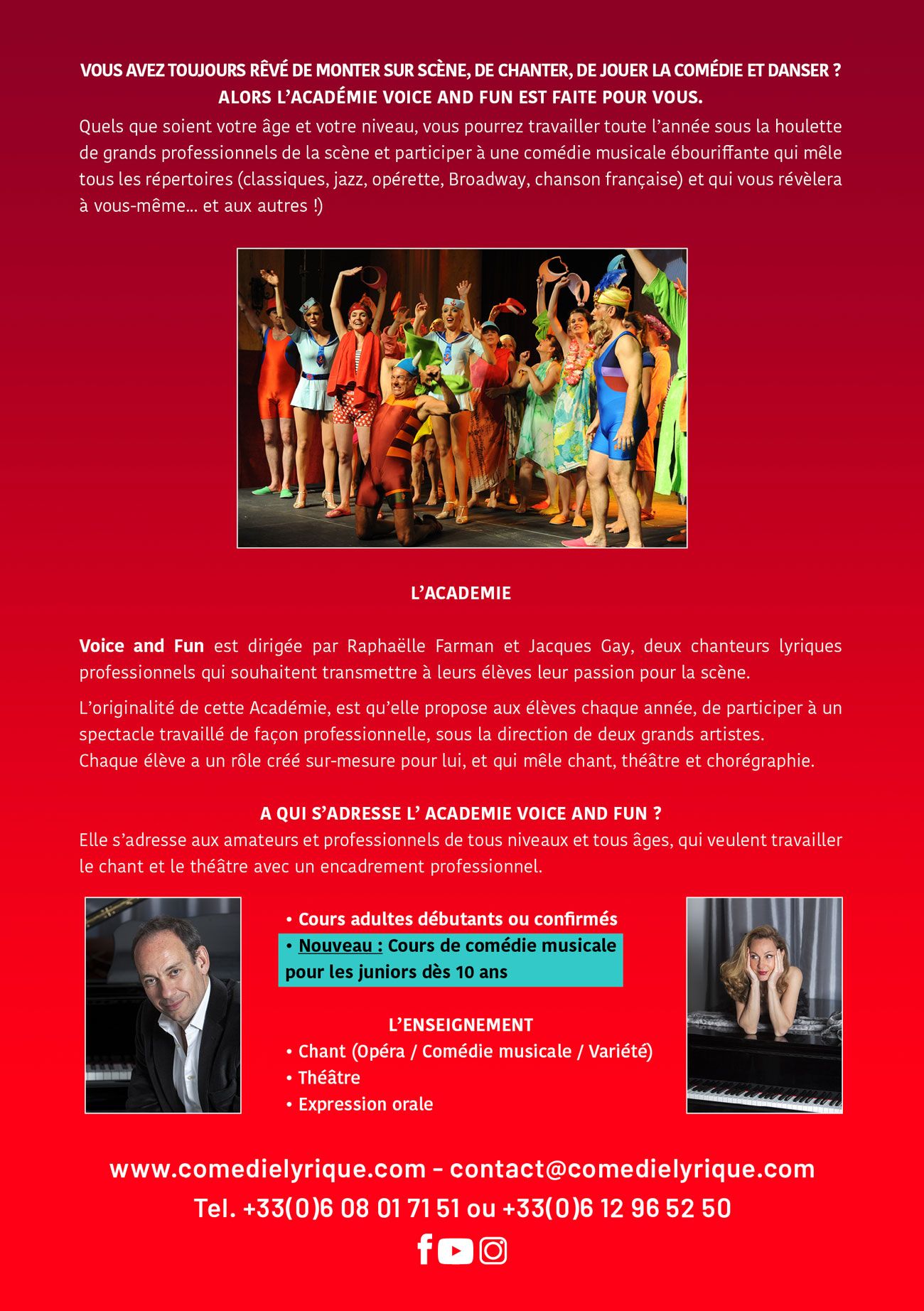 Très régulièrement sur scène dans de nombreux spectacles, ils mettent à profit leur grande expérience pour enseigner le chant et le théâtre de manière à la fois ludique, et très professionnelle.